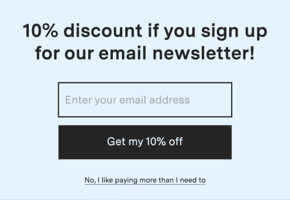 Here is an example of a simple newsletter signup with two elements of dark patterns: Visual Interference and Confirmshaming.
